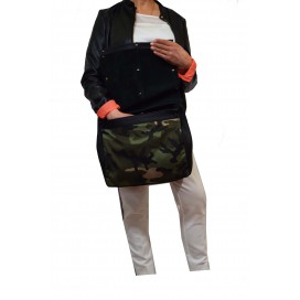 avec finitions en tissu imprimé militaire fermé par deux boutons pression,